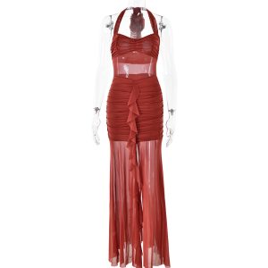 Hot selling new women’s clothing halterneck splicing sleeveless gathered backless slim dress